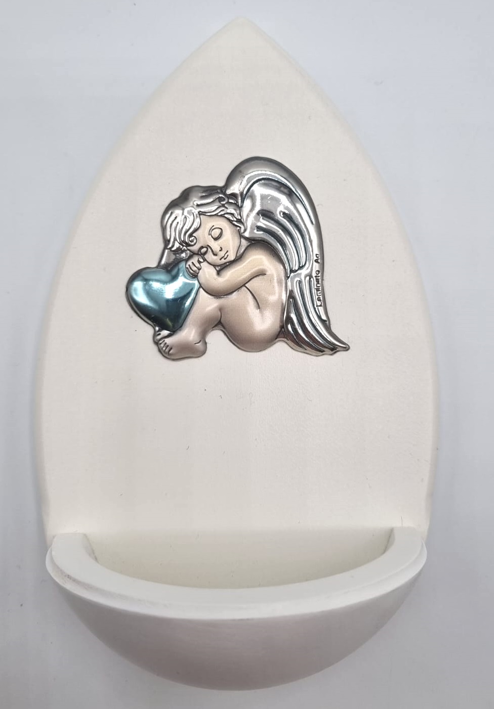 Weihwasserkessel Schutzengel silber mit blauem Herz, weiß